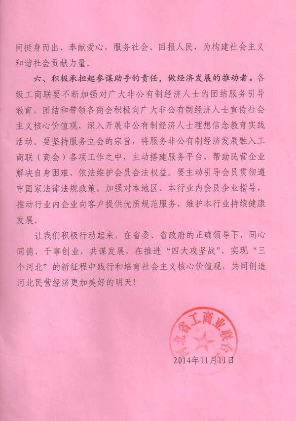 河北省工商聯踐行社會主義核心價值觀倡議書