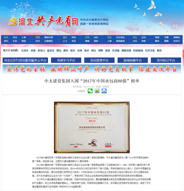 河北共產(chǎn)黨員網(wǎng)報(bào)道了“中太建設(shè)集團(tuán)入圍“2017年中國承包商80強(qiáng)”榜單”