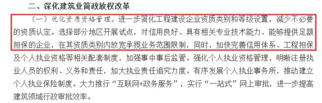2017年2月24日,國務院辦公廳下發《關于促進建筑業持續健康發展的意見》(國辦發〔2017〕19號),將“優化資質資格管理”作為首要事項,放在文件“深化建筑業簡政放權改革”的第一條,足見重視程度。