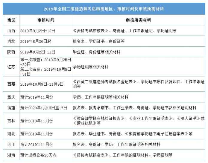 二建考試到現在已過了五月,大部分省市都已公布成績及合格標準。2019年有不少省市二建是有要求考后審核的。除了江西,其他地方怎么規定呢?
