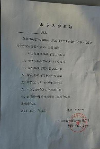 經董事局研究決定,中太建設集團將于2010年元月20日上午830分在中太大廈16樓會議室召開股東大會。