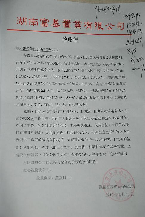 感謝信中說,615,富基.世紀公園隆重開盤,銷售突破2.1億元,這些驕人成績都離不開中太集團的精誠合作與大力支持。同時他們表示,雙方將在項目的后續工程建設中,相互支持,攜手實現“戰略雙贏”。