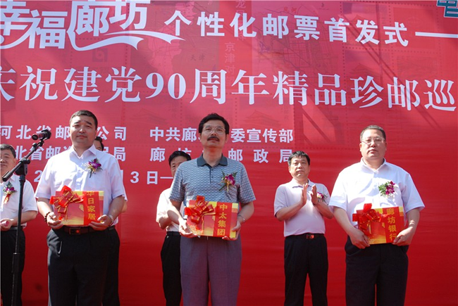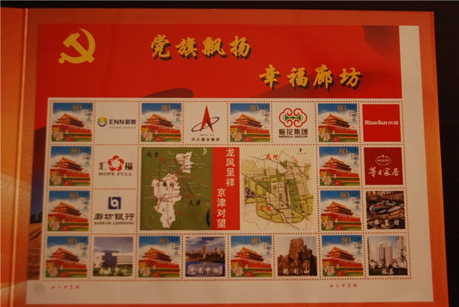 6月3日上午,由廊坊市委宣傳部與廊坊市郵政局共同推出的《黨旗飄揚(yáng) 幸福廊坊》個(gè)性化郵票在廊坊市博物館舉行首發(fā)式。《黨旗飄揚(yáng)·幸福廊坊》個(gè)性化郵票共“1+12”幅圖案。“1”即中心主圖案,體現(xiàn)廊坊市“龍鳳呈祥,京津?qū)ν钡膮^(qū)位優(yōu)勢,“12”即12幅輔圖,其中4幅分別為會展中心、居民小區(qū)、文化藝術(shù)中心、中央生態(tài)城,體現(xiàn)“智能、生態(tài)、商務(wù)、休閑”的廊坊