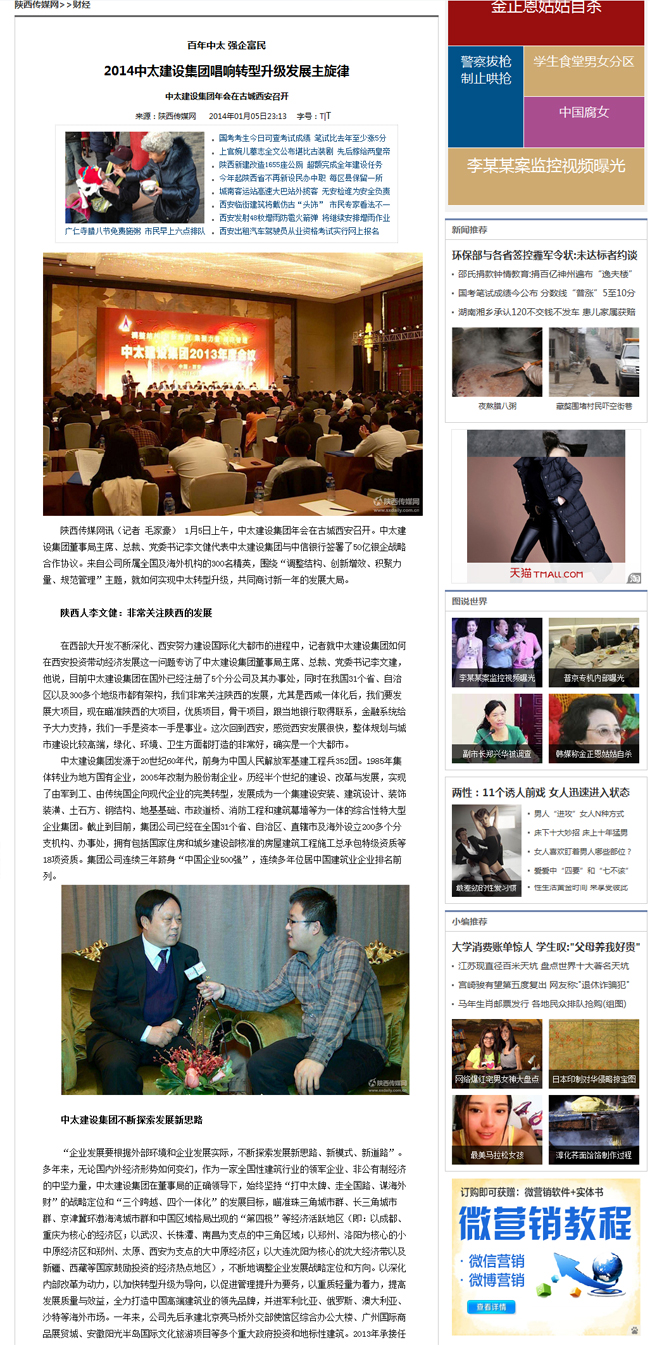 陜西傳媒網(wǎng)2014年01月05日報道了2014中太建設(shè)集團(tuán)唱響轉(zhuǎn)型升級發(fā)展主旋律