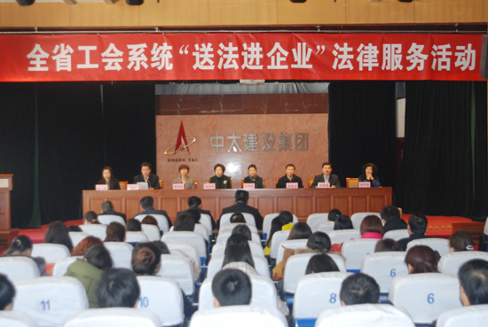 在深入開展黨的群眾路線教育實踐活動中,為更好地服務企業與職工,建立完善和諧的勞動關系,營造企業以法治企、健康發展的良好氛圍。3月20日上午,由河北省政協常委、省總工會巡視員郭俊苓帶隊的省工會系統“送法進企業”法律服務工作組(省總工會法律部部長劉偉青、省總工會法律部副部長馬金占一行3人),在市總工會黨組成員、副主席田會蘭的陪同下,走進中太建設集團,為集團公司員工帶來了法律服務講座,并現場贈發了相關書籍。市總工會副調研員、辦公室主任李寶秋主持講座。