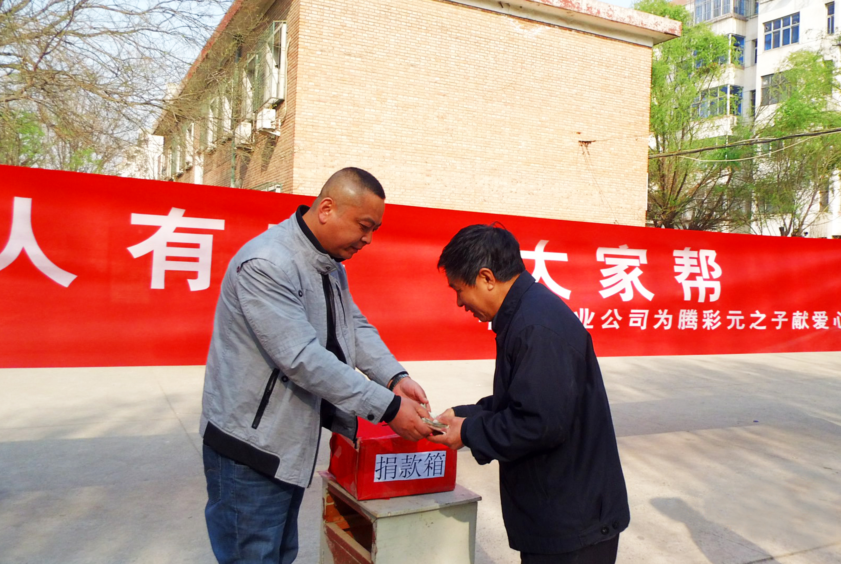 倡議一經發出,廣大員工積極響應、踴躍捐助,一時間,中太集團公司內部形成了一片“愛的海洋”。每位同事們都慷慨解囊盡力支持,500、300、200、100、50……雖然不多,但是每個人都用自己的實際行動,默默地向騰彩元一家表達著祝福與關切。因為騰彩元早已退休,所以公司現在的很多員工并不認識他本人,但愛心沒有界限,同事們并不在意。他們說,雖然沒見過其本人,但他和我們有一個共同的稱號“中太人”,同胞有難,我們理應攜手共渡難關。中太集團物業公司更是專門在小區里舉行了一場“為特困職工騰彩元捐款”的愛心募捐活動,大大的紅色條幅和身著工作服的保安、保潔人員分外引人注目,大家自覺排隊按順序走到捐款箱前一一獻出了自己的愛心。更有正在上崗的保安、保潔人員得知消息后,一到換崗時間馬上就趕到了捐助現場,掏出身上有零有整的錢盡數投到了捐款箱內……在募捐現場,共集得善款4738元。雖然錢數不多,但是收入相對微薄的他們,并沒有吝嗇他們的大愛,“這百八十的對咱們來說算不了什么,但是人家還等著救命呢!”、“多少都是一點心意,幫幫這家人吧,太不容易了!”、“誰還能不趕上點事,能幫大伙兒就幫幫吧!”……他們的行動感染著小區里的群眾,許多素不相識的人們在了解情況后也都紛紛伸出了援助之手,一時間,小區里洋溢著濃濃的愛的氛圍。六公司、鋼結構、三河分公司、十一局等單位也在第一時間響應了集團公司的倡議,紛紛慷慨解囊,截止到4月16日,集團上下已捐得愛心款66290元,交到了騰彩元手里,給4月17日就要進行手術的騰彩元一家,解了燃眉之急。
