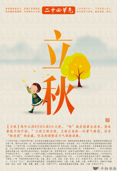 今天是立秋,意味著夏季的結束,秋季的開始,氣溫逐漸下降,雨水逐漸減少。我國幅員遼闊,就節氣而言不可能同時進入涼爽的秋季的,是有一些差別的。生活在廊坊這個地方,四季分明的氣候,是老天恩賜的福分。不冷不熱的天,氣候宜人,真正是秋高氣爽。我國古代將秋季劃分為三候:一候涼風至,二候白露生,三候寒蟬鳴。是說立秋后刮風人們會感到涼爽,大地早晨會有霧氣產生,并且秋天感陰而鳴的寒蟬也開始鳴叫。民間流行“貼秋膘”,就是在立秋這天吃些美味佳肴,老百姓家就是燉肉、包餃子。